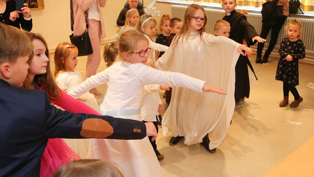 Dzieci przedstawiły dobrze znane wszystkim wydarzenia pamiętnej nocy w Betlejem. Młodzi aktorzy zagrali swoje role z przejęciem i zaangażowaniem: Maryja i Józef w swej wędrówce dotarli do stajenki, „gdzie narodziło się Dziecię – Bóg“ , chór aniołów ogłosił światu przyjście Syna Bożego, ubodzy pasterze i trzej królowie oddali pokłony Dzieciątku, Jezusa odwiedziły też dzieci.